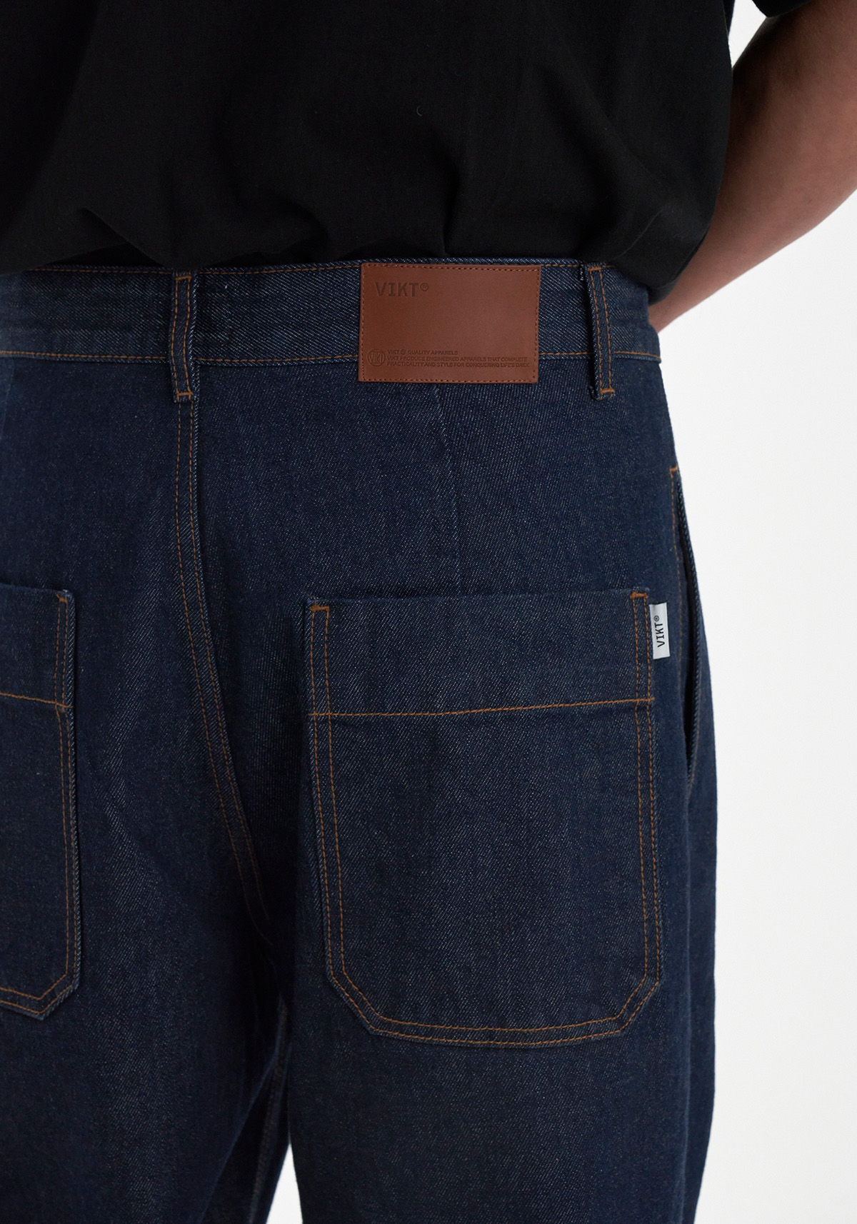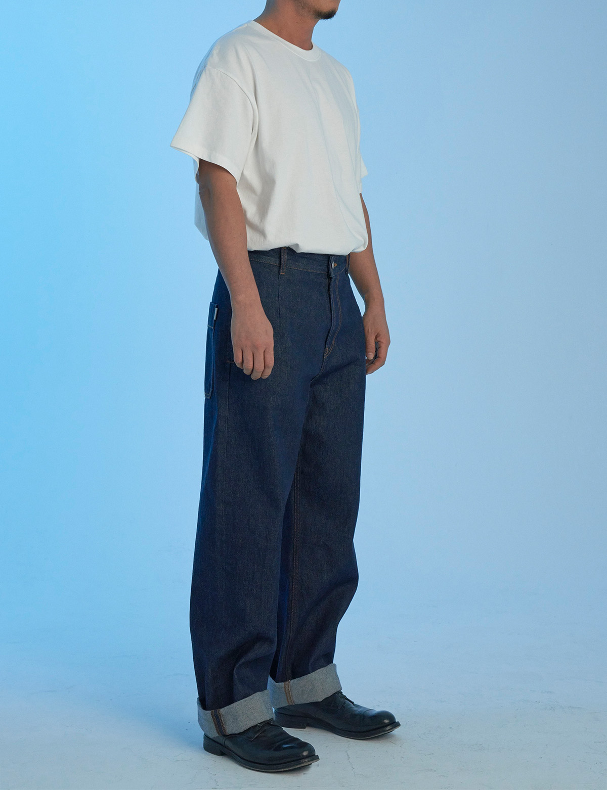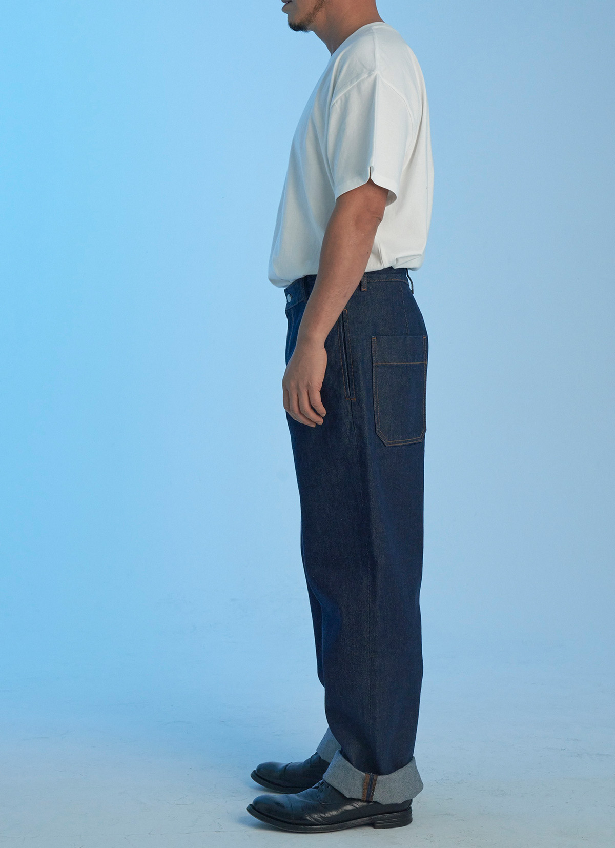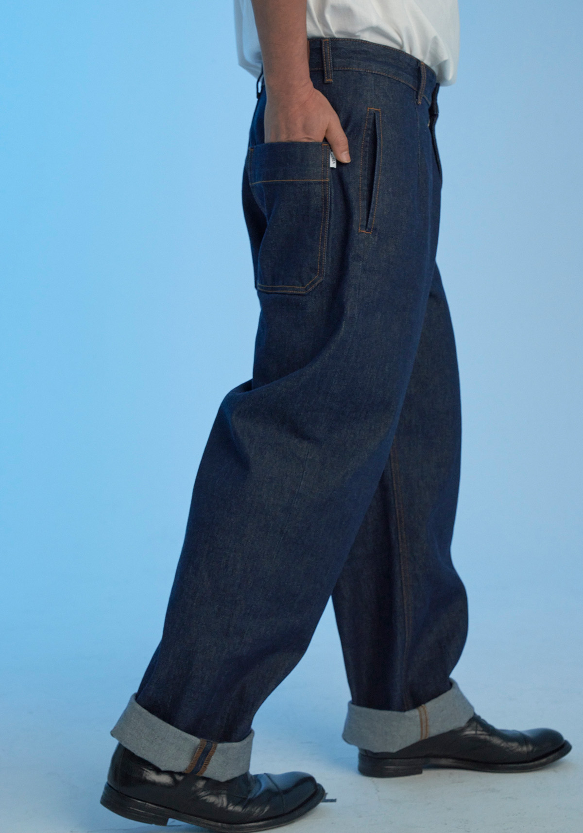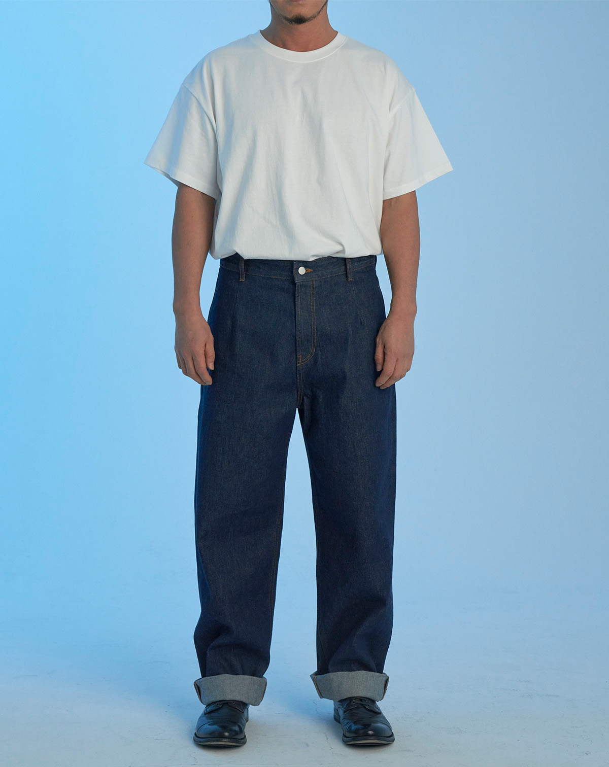 - 여유 있는 실루엣의 테이퍼 스핏 데님 팬츠